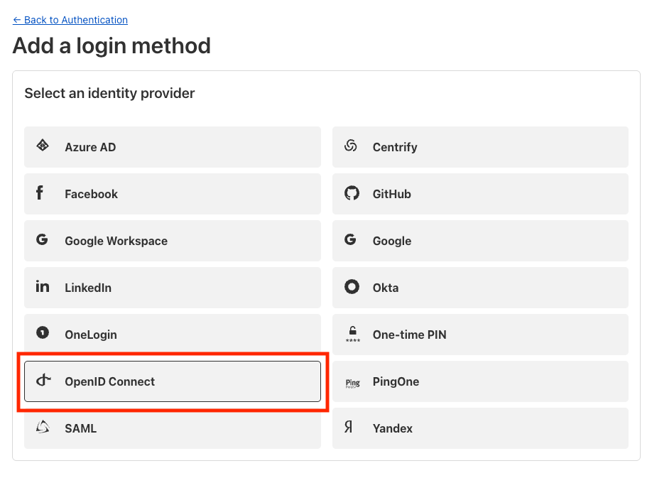 - Go to Zero Trust > Settings > Authentication > Login methods and choose Add new.