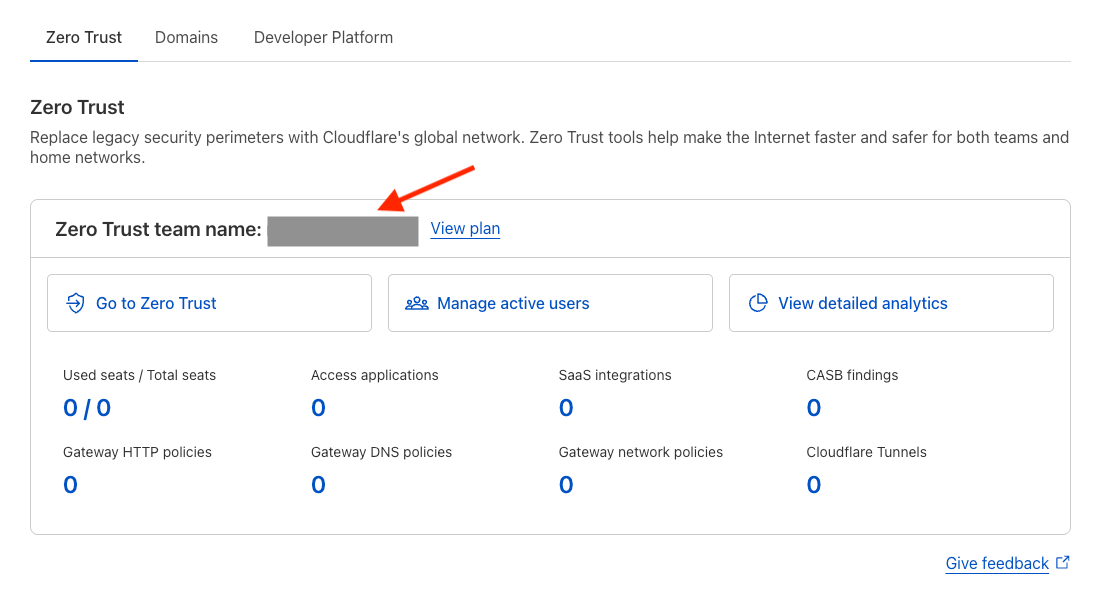 Sign in to the Cloudflare Dashboard and locate your *ZERO_TRUST_TEAM_NAME*
